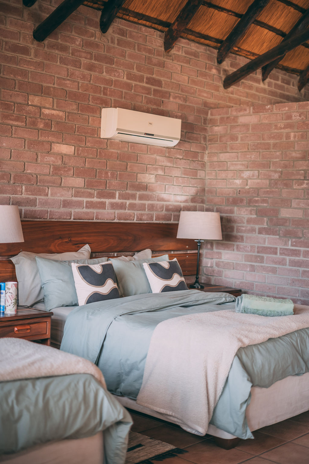 Kudu Chalet Private thatched chalet with two double beds. Air conditioning, Nespresso machine, bar fridge with milk and water. All towels and amenities provided. Animals roam freely between chalets. Breakfast and dinner served at the Farmhouse with boma fireplace and pool access. Sleeps: 2 adults or 2 childrenMaximum stay: 2 nights Check Availability & Book
